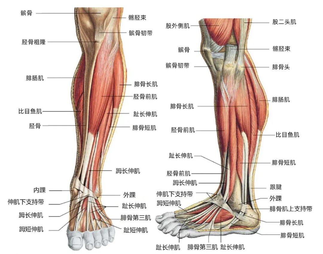 有的人可能会有一块胫前筋膜肌(Tibiofascialis anterior),这是一块小肌,起自胫骨下部。
