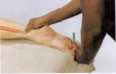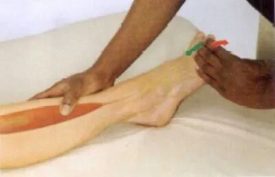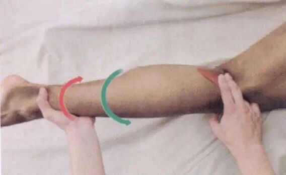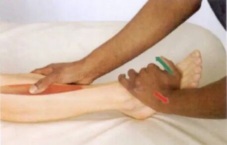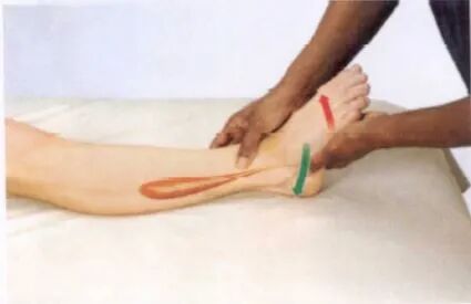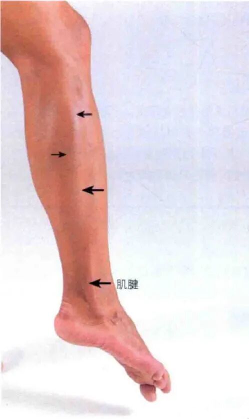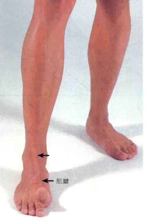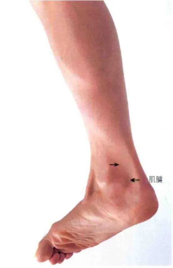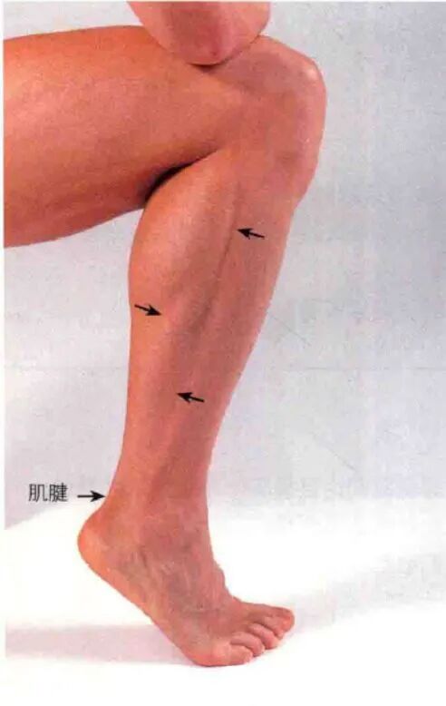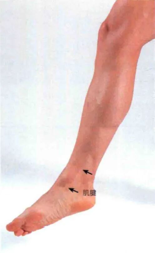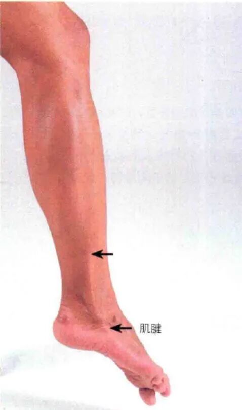 沿小腿向下可触及扁平的跟腱,并可触及至其在跟骨后面的附着点。