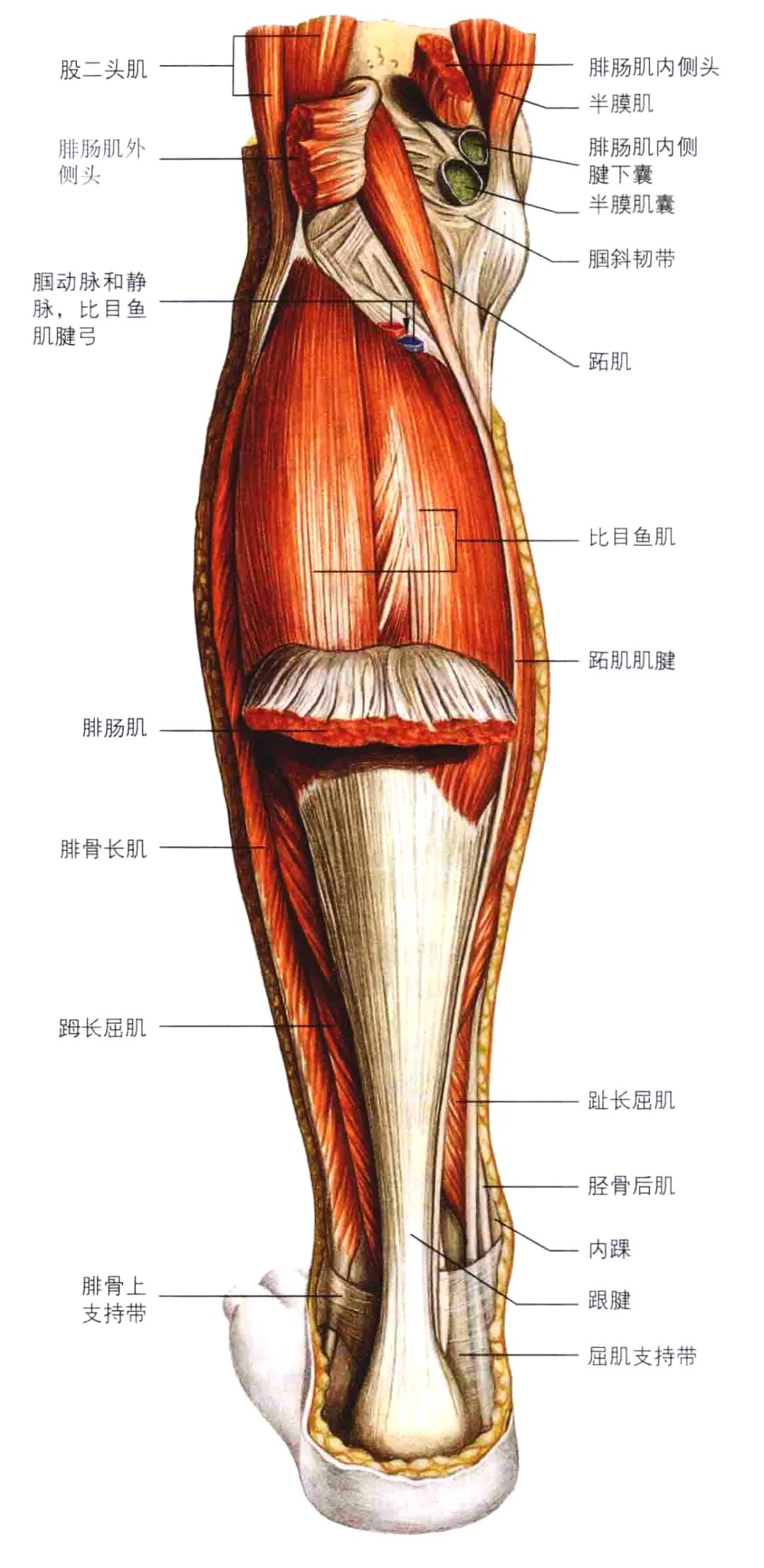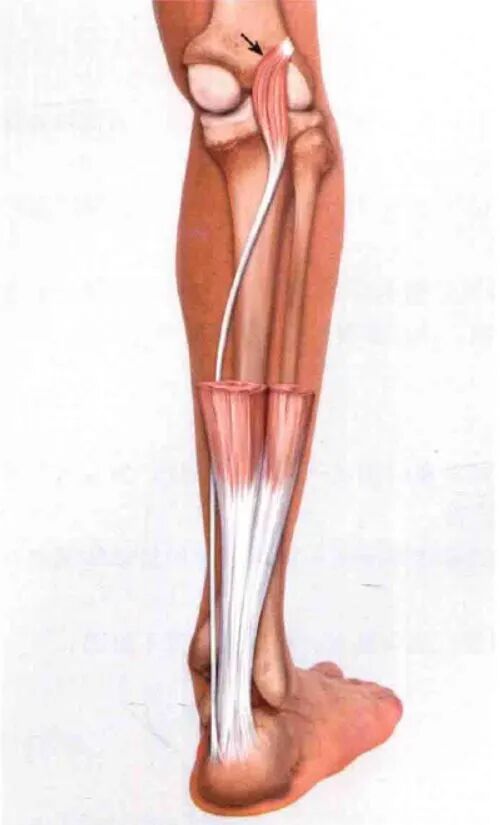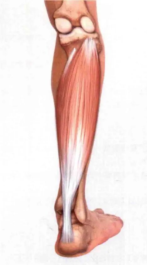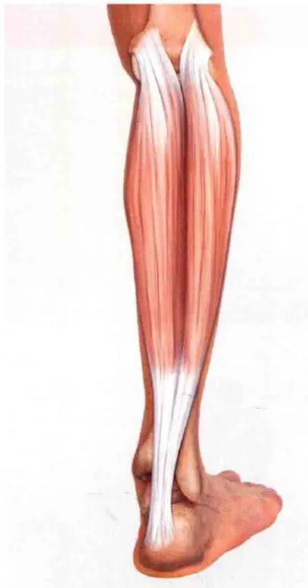 止于跟腱。来自两个肌头的腓肠肌主体汇合,附着于一条宽阔的膜性肌腱的后表面,随后,该肌腱与比目鱼肌腱融合,形成跟腱的上部。这条宽阔的肌腱逐渐变窄,直至到达跟骨处,随后再次扩张,附着于跟骨后表面中部。