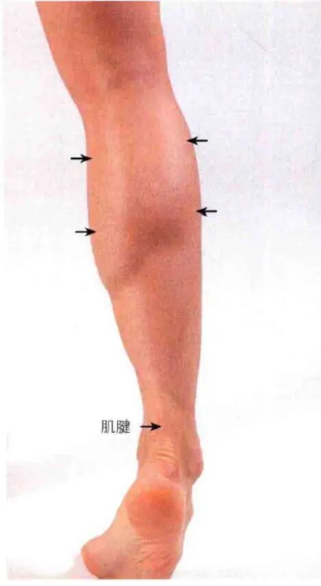 在膝关节后方,小腿上部两侧可触及腓肠肌的两条巨大肌腹。内侧头位置较高,外侧头位置较低。