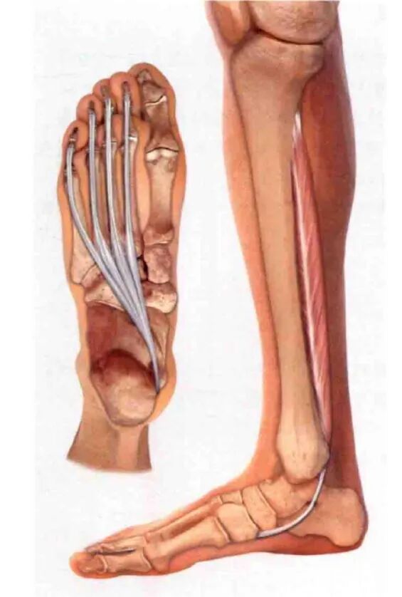 腓骨长肌腱和胫骨前肌腱一起构成“解剖学U型马镫”状结构,作用是动态稳定足横弓和内侧纵弓,达到减震和适应不平坦地面的功能。