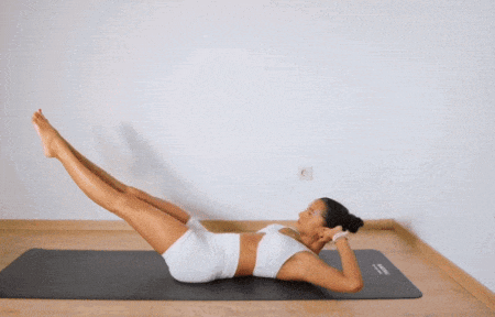 平躺,腰椎贴实垫面,双手枕在头后,腰腹收紧,双腿斜向上抬高。