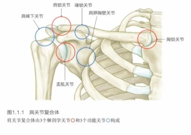 肩部由盂肱关节、胸锁关节、肩锁关节3个解剖学关节和肩峰下关节、肩胛胸壁关节、喙锁关节(喙锁机制)3个功能关节构成。