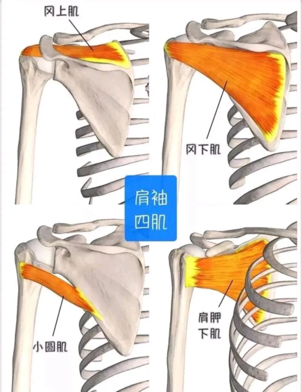 由冈上肌(启动外展)、冈下肌和小圆肌(外旋)、肩胛下肌(内旋)组成,紧贴肱骨头,在肩关节活动时: