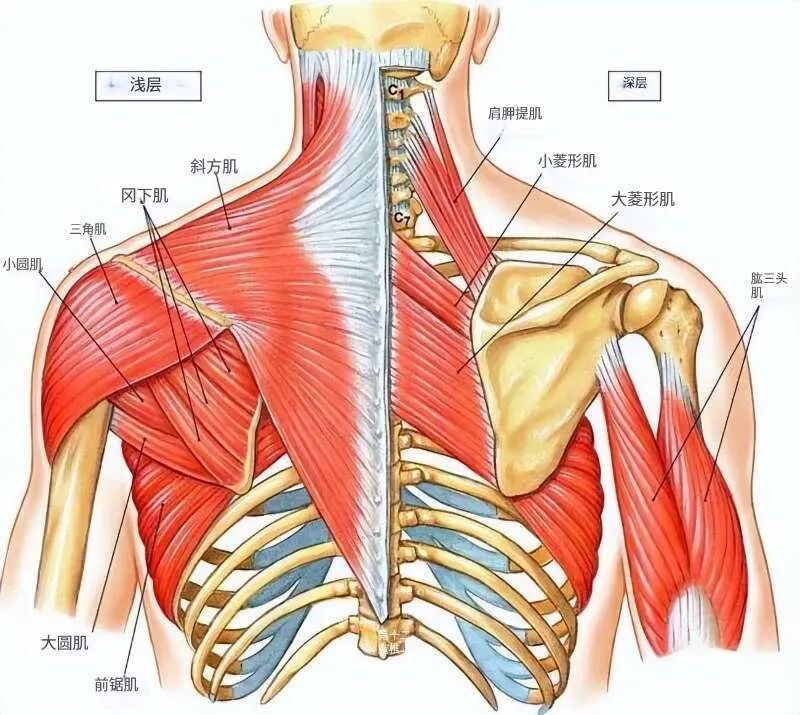 - 斜方肌(上、中、下束):分别负责肩胛骨上提、后缩和下沉。