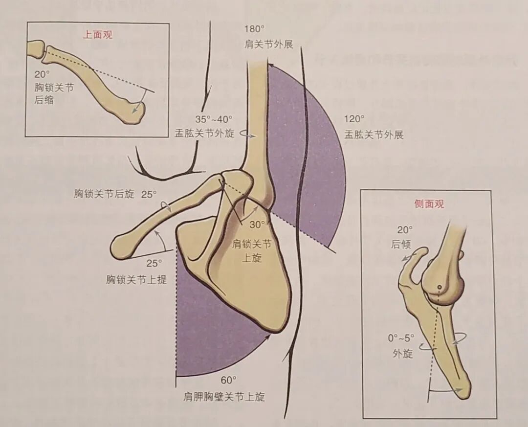 - 胸锁关节:允许锁骨约25°的上抬/下沉、前移/后移及轴向旋转。