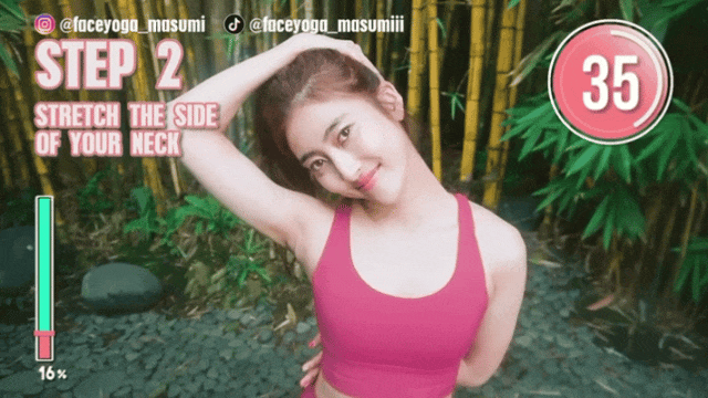 这套抬头提拉动作,依据肌肉力学原理设计,通过规范伸展,有效放松紧张斜方肌与颈部前侧肌群,改善颈部短粗、含胸圆肩,同时轻柔收紧下颌周边软组织,让轮廓更舒展。