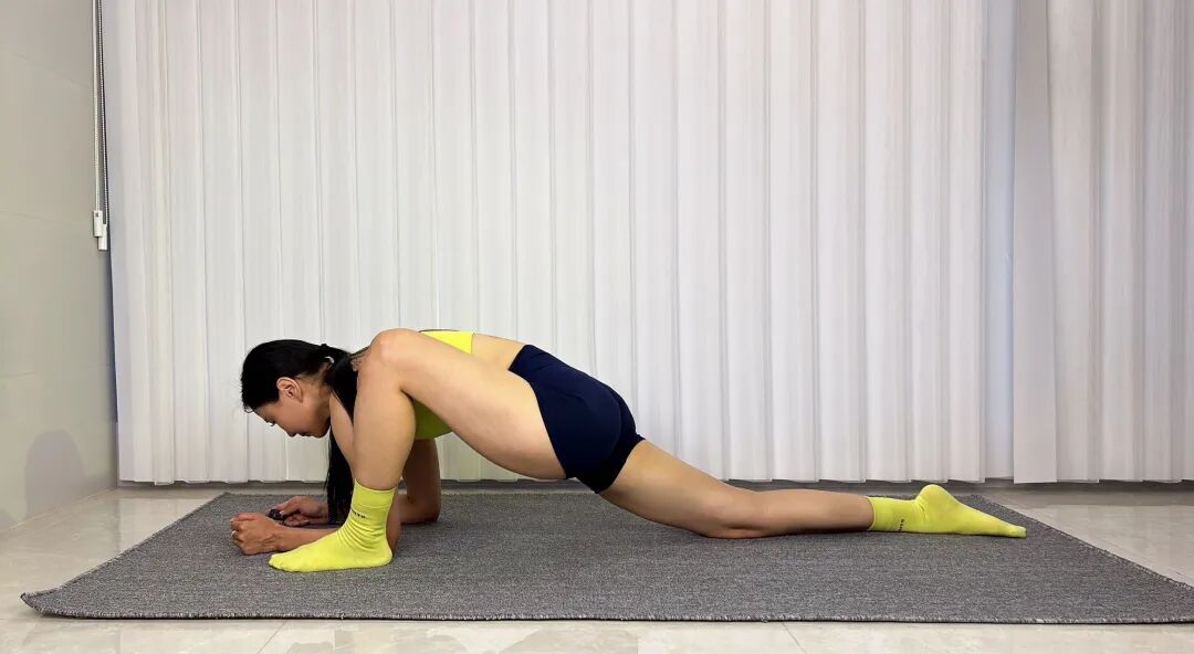 手肘撑地,一侧腿向前跨在手肘旁,另一侧腿向后伸直,髋部下沉,感受髋部的深度拉伸。