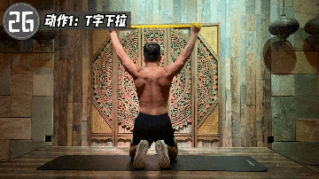 跪姿,双手拉住弹力带,一手向上,一手向下。