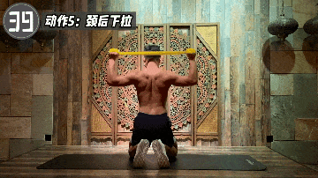 呼气,双肘向下,带子拉到脑后位置,背部收紧。