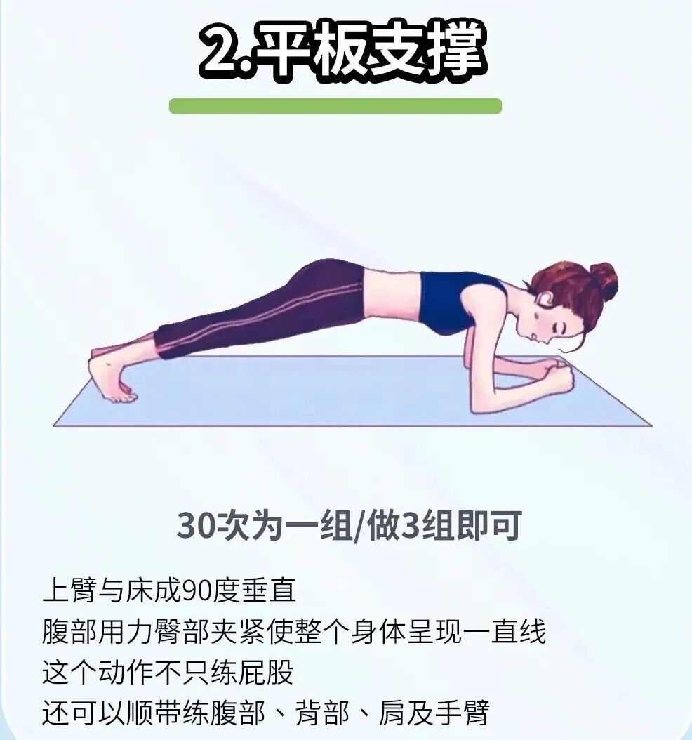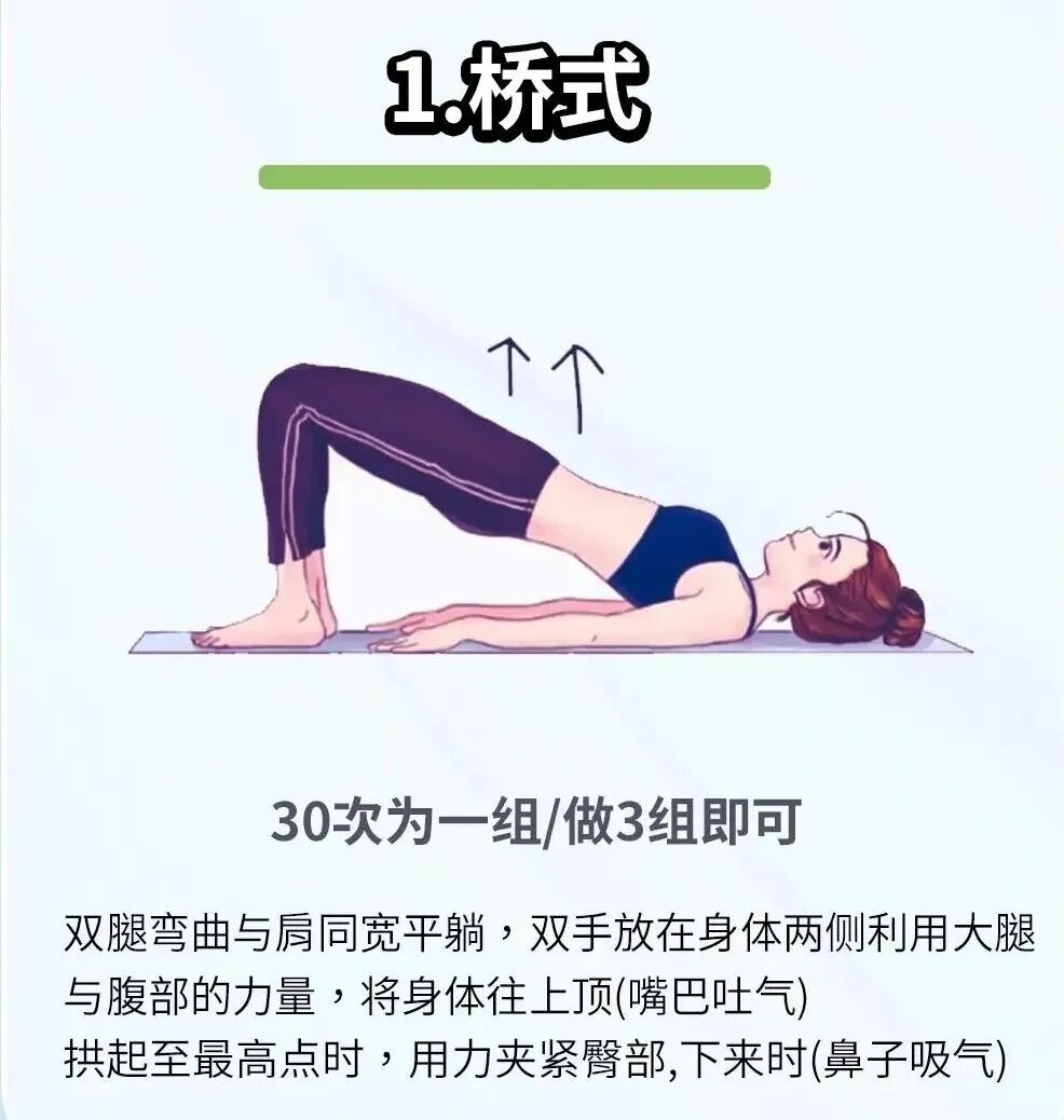 练习目标:改善臀部下垂、扁塌、凹陷的问题,紧致臀部,练出翘臀、蜜桃臀。