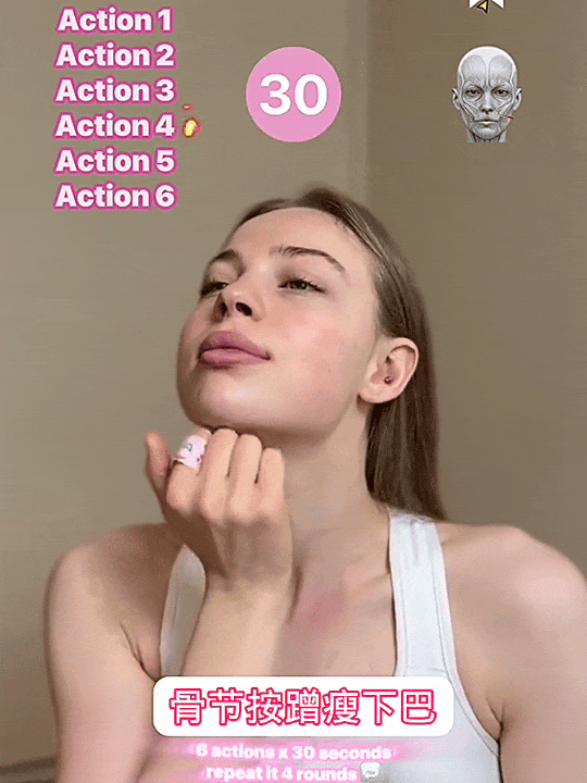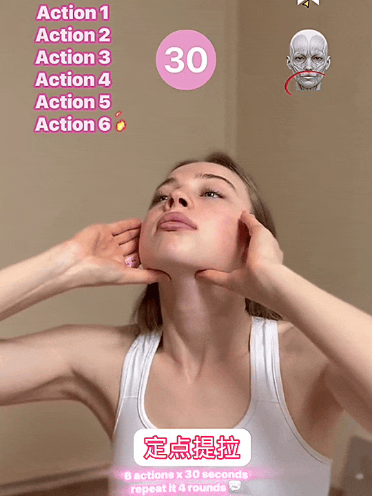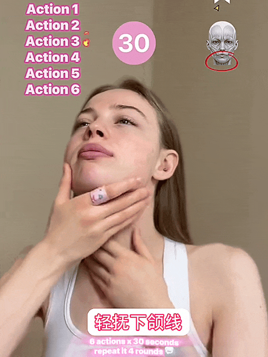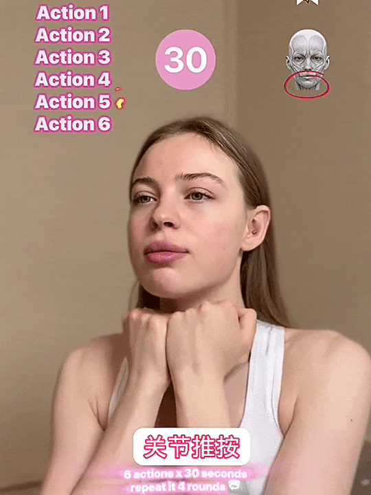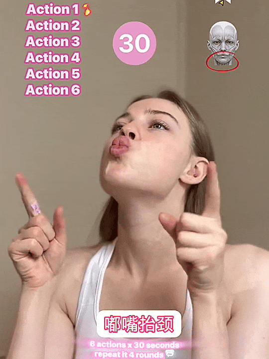 嘴巴用力向前嘟起(类似向前亲吻一下),同时双手十指伸直,向上轻轻指一下,感受下巴肌肉收缩;