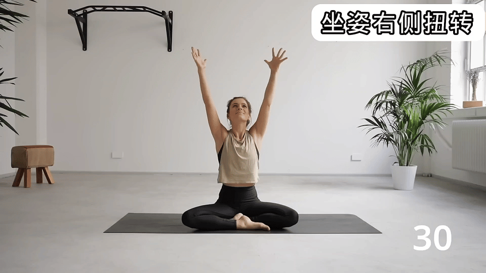 动作2:坐姿右侧扭转(拉伸肩颈和侧腰)