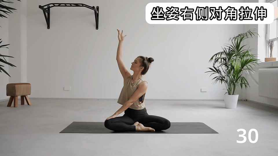 保持30秒,感受右侧肩颈和右侧腰的拉伸感,呼吸均匀,然后慢慢放下来。