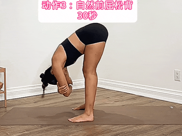 前屈幅度量力而行,自己感觉舒服就好,重点是感受腰背拉伸。