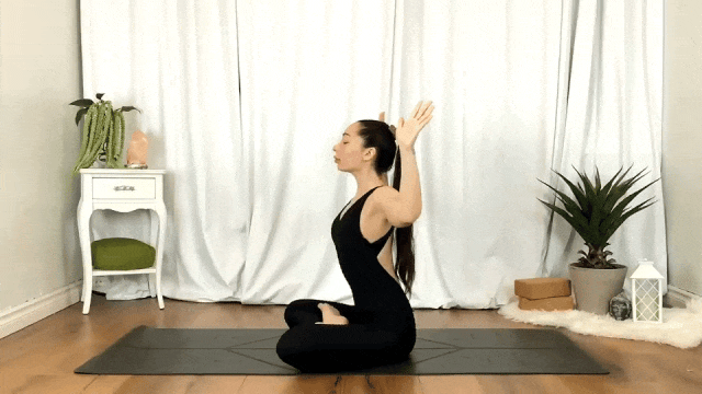 坐姿,双手举过头顶,延展脊柱;