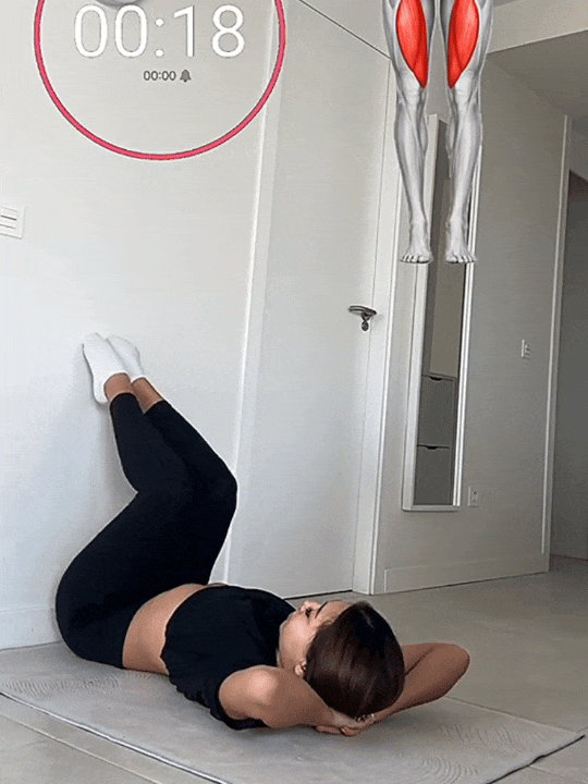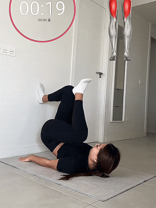 后背贴地,双脚踩实墙面,膝盖微屈,保持不动;