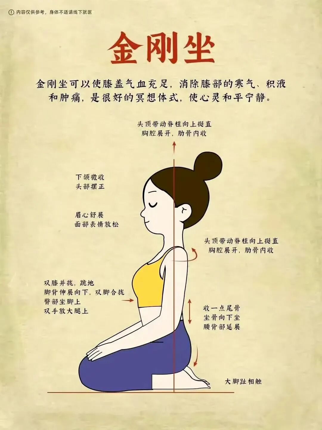 如果膝盖不适,可以在下面垫个软垫或者折叠的毛毯; -