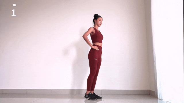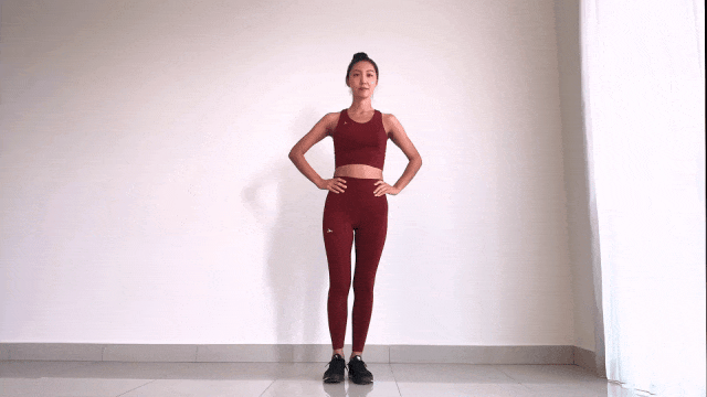 双手叉腰,稳住身体,核心收紧,腰背保持挺直;