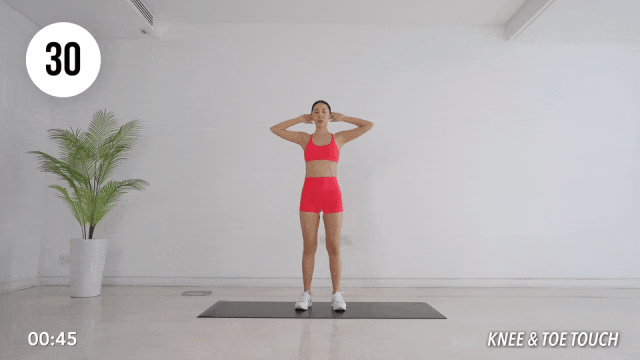抬腿的同时,胳膊向下拉,感受腹部和臀腿发力;