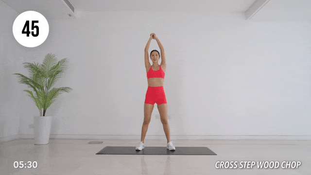 右脚向左后方跨出交叉步,双手从右上方向左下方摆动;