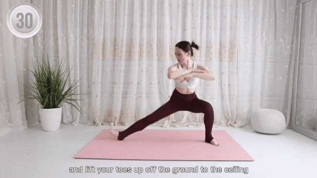 脚后跟全程贴地,脚尖回勾,拉伸感更足。