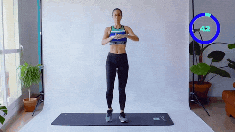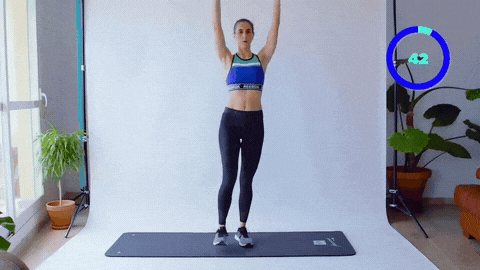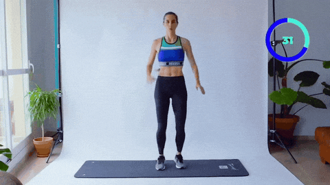 → 吸气时双脚跳回并拢,双手下放回身侧。动作流畅有节奏,落地时膝盖微屈减震