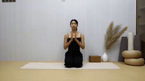 →臀部向下坐、蹲下来,双手在胸前合掌