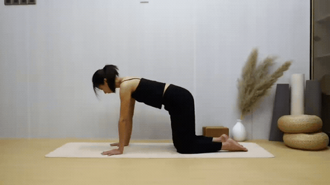 →呼气时臀部向内卷、背部拱起、低头看肚脐