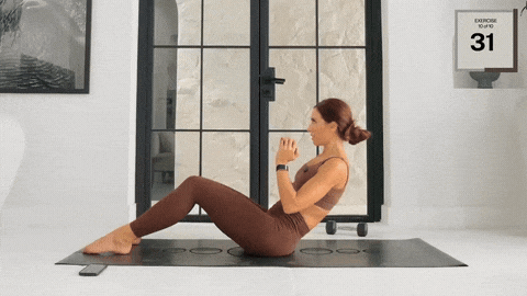 → 屈膝坐在垫上,双手抱哑铃于胸前,脚掌轻踩地面