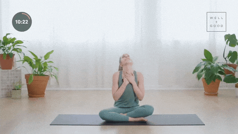 → 盘腿坐在垫子上,双手轻放在锁骨上方