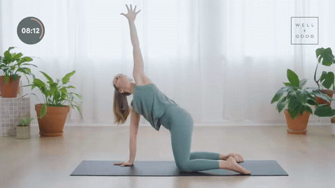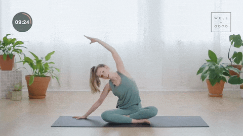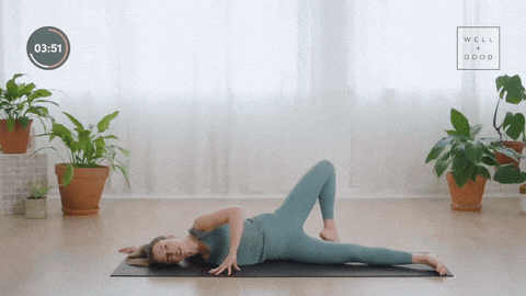 → 呼气时,身体向右侧倾斜,感受左侧腰部和肋骨有拉伸感