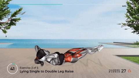 → 然后做双腿抬举,呼气时双腿同时抬起