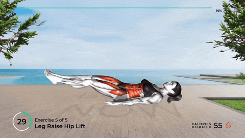 → 继续呼气,用下腹的力量把臀部抬离地面3-5cm