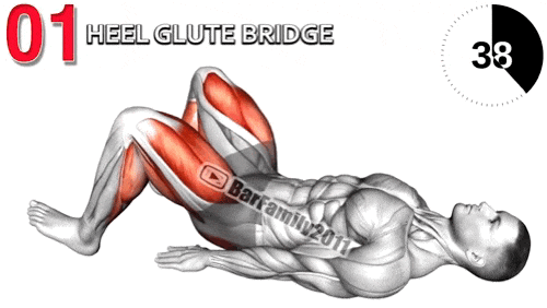 → 呼气时,收紧臀部和盆底肌,用脚跟蹬地把髋部推高