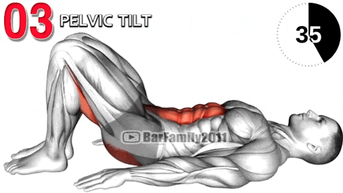 → 呼气时,收紧下腹和盆底肌,让下背轻轻压向地面,骨盆微微向上后倾