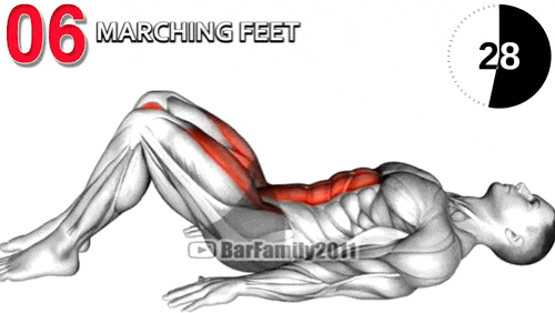 → 仰卧,双脚与髋同宽,膝盖弯曲,脚尖翘起只有脚跟着地