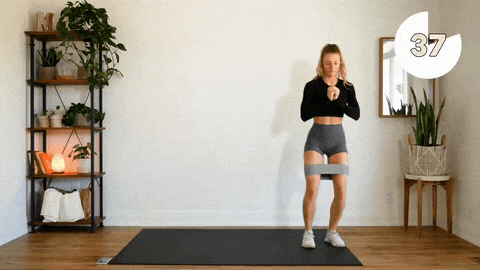 → 弹力带套在膝盖上方,双脚与肩同宽站立,下蹲至大腿与地面成45度角