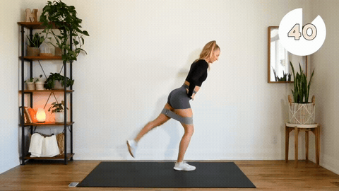 → 站立,可以扶墙或椅背保持平衡,弹力带保持在膝盖上方