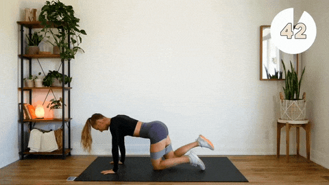 → 四点支撑,双手在肩正下方,膝盖在髋正下方,弹力带套在大腿上方