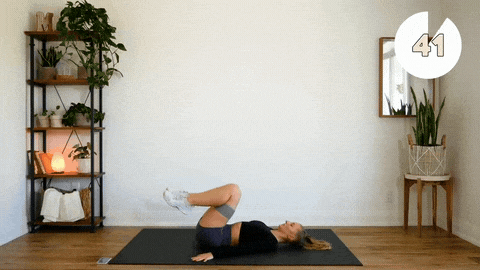 → 双手放身体两侧掌心向下,核心收紧让下背贴地