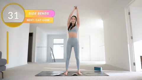 → 呼气时,双手带动上身向左侧弯,髋部保持稳定不动。弯到感觉右侧腰、肋骨有明显拉伸感