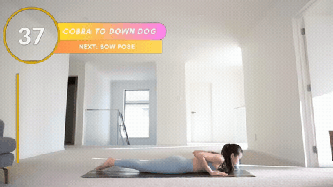 → 呼气时,臀部向后向上推,回到下犬式。