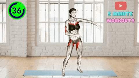→ 呼气时,胯向右顶,右侧手屈肘上抬,左手自然放下