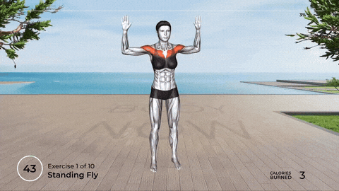 → 双臂抬至胸前,手肘弯曲90度,前臂平行于地面,双肘在身体两侧与肩同高