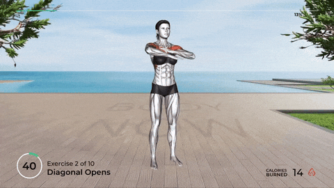 → 吸气时,双臂交叉回到胸前,换成左手在外右手在内,再次打开变成左上右下。交替进行