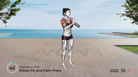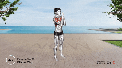 → 呼气时,双手掌用力互推,保持3秒,感受胸肌内侧和腋下前侧同时收紧