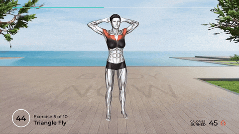→ 呼气时,双肘向前下方合拢,轨迹像画一个倒三角,手肘尽量靠近