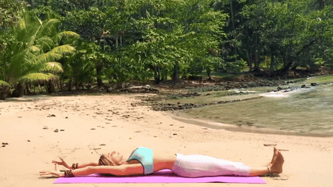 → 仰卧,双脚脚掌相对,膝盖向两侧打开,双臂在头顶伸展或放在身体两侧