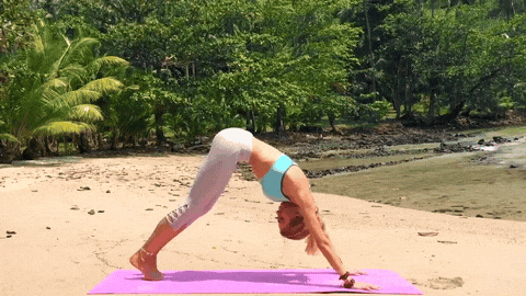 → 从四足跪姿,脚尖踩地,呼气时臀部向上推高,身体呈倒V字型